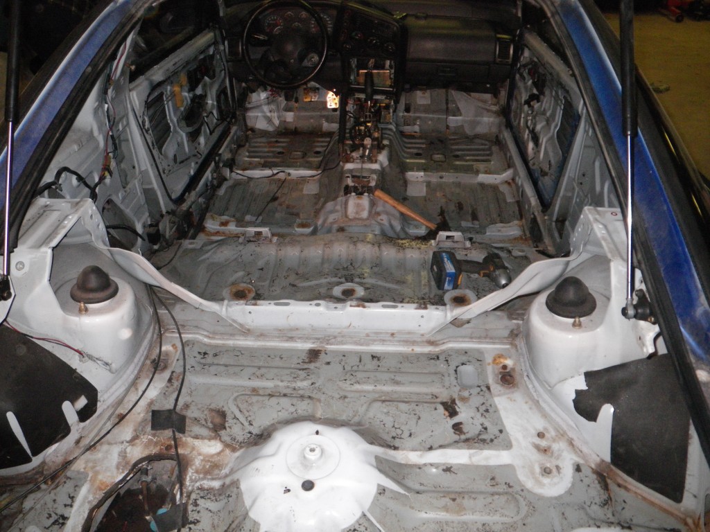 We found a fair bit of rusty stuff but nothing too bad so Ryan got the cage built and the seat bases and anchors in and the seam welding done while we did other stuff. You can check out all our old posts if you want more details, like here here and here. The head room looked a bit sketchy so we spent some time figuring out how to maximize that, we bought a rally suspension and a load of rally wheels and tires and some spares from Don Morton, who built and raced a 93 Laser with his wife, and we tried to get things sorted out so we could put it back together. Then one day we pulled the body cladding off the doors and body of the car and….crap.